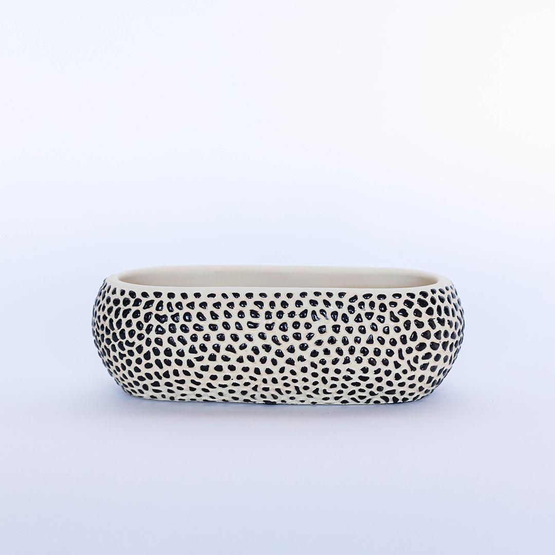 Oval-shaped flower pot with a textured black and beige pebble design.