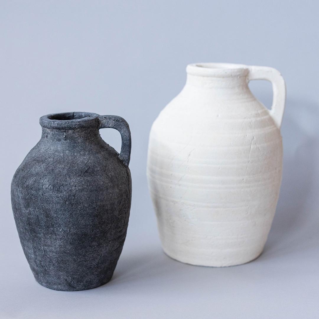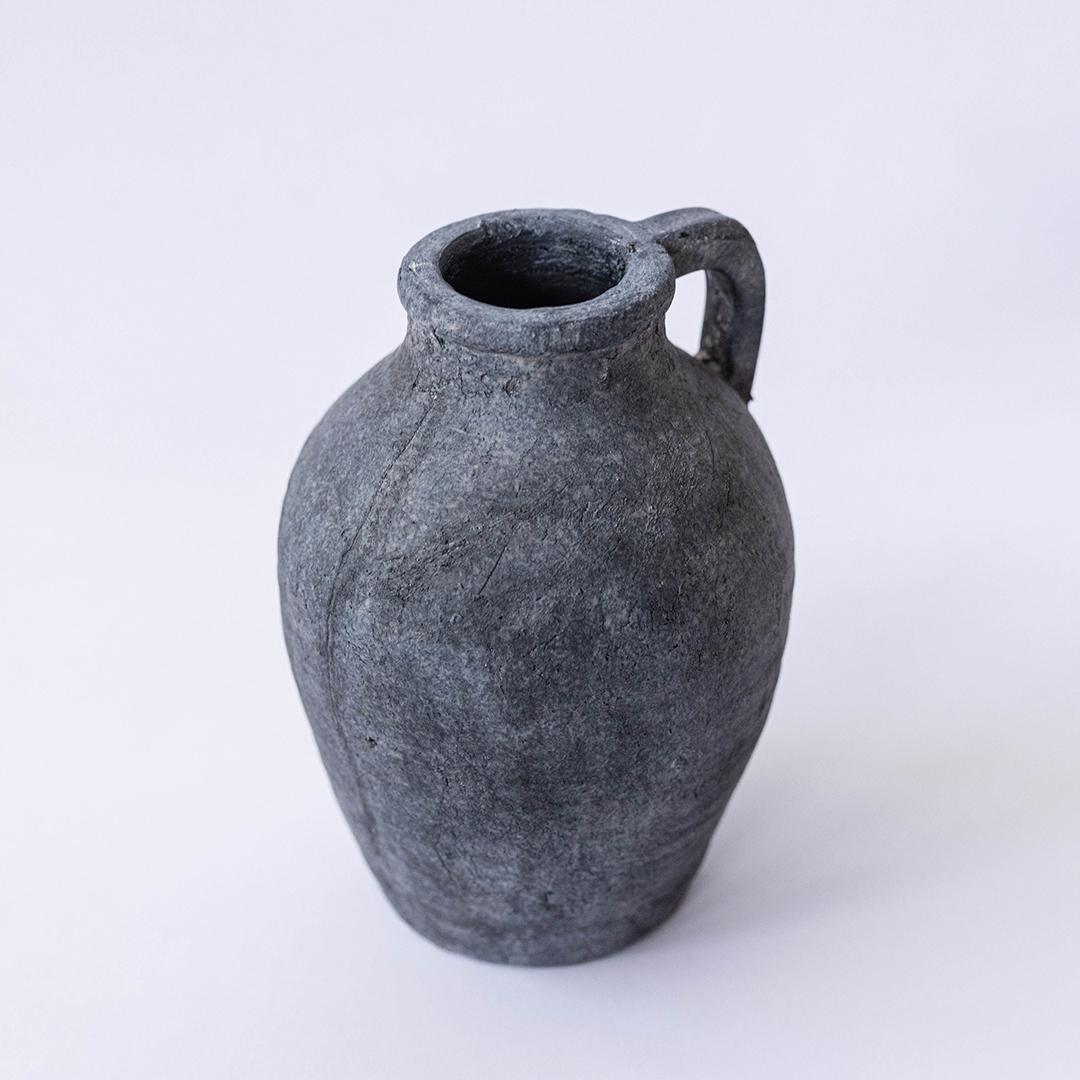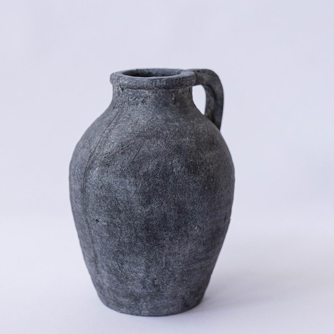 Cement vase with a handle.
