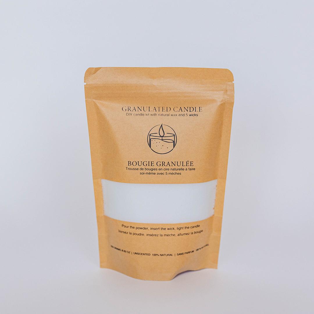 DIY candle kit with natural wax granules and 5 wicks. Just pour the sand, insert a wick, and light – easy and fun candle making.