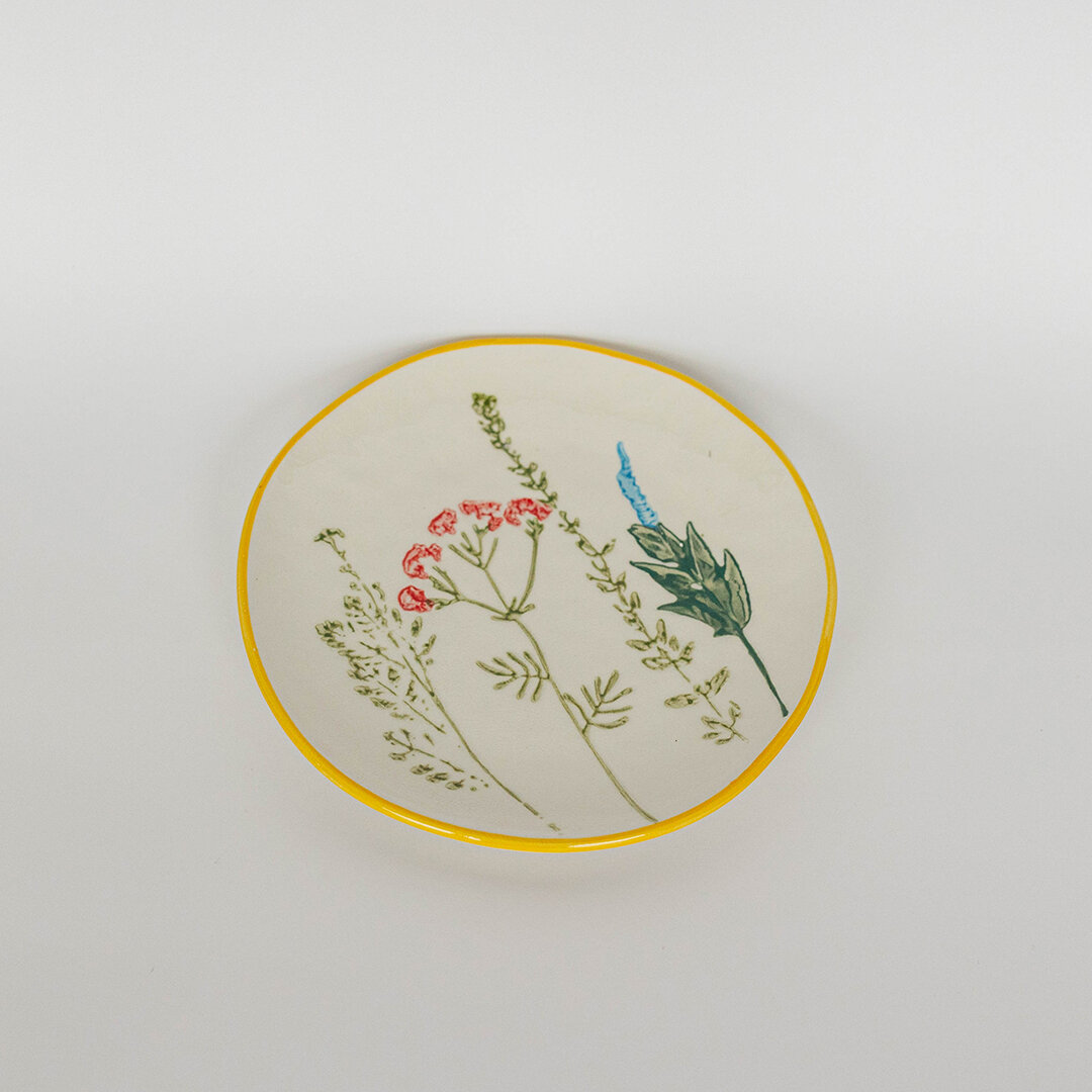 Hand-painted plate with crackled glaze, field flowers pattern and yellow trim.